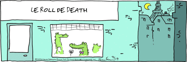 Alligators are western hemisphere critters. Crocs, other than Rene LaCoste & Eleonore, aren’t exactly French. The art – Mais Non! In sum, the attempted joke is not hard to understand. The execution is not of French efficiency.