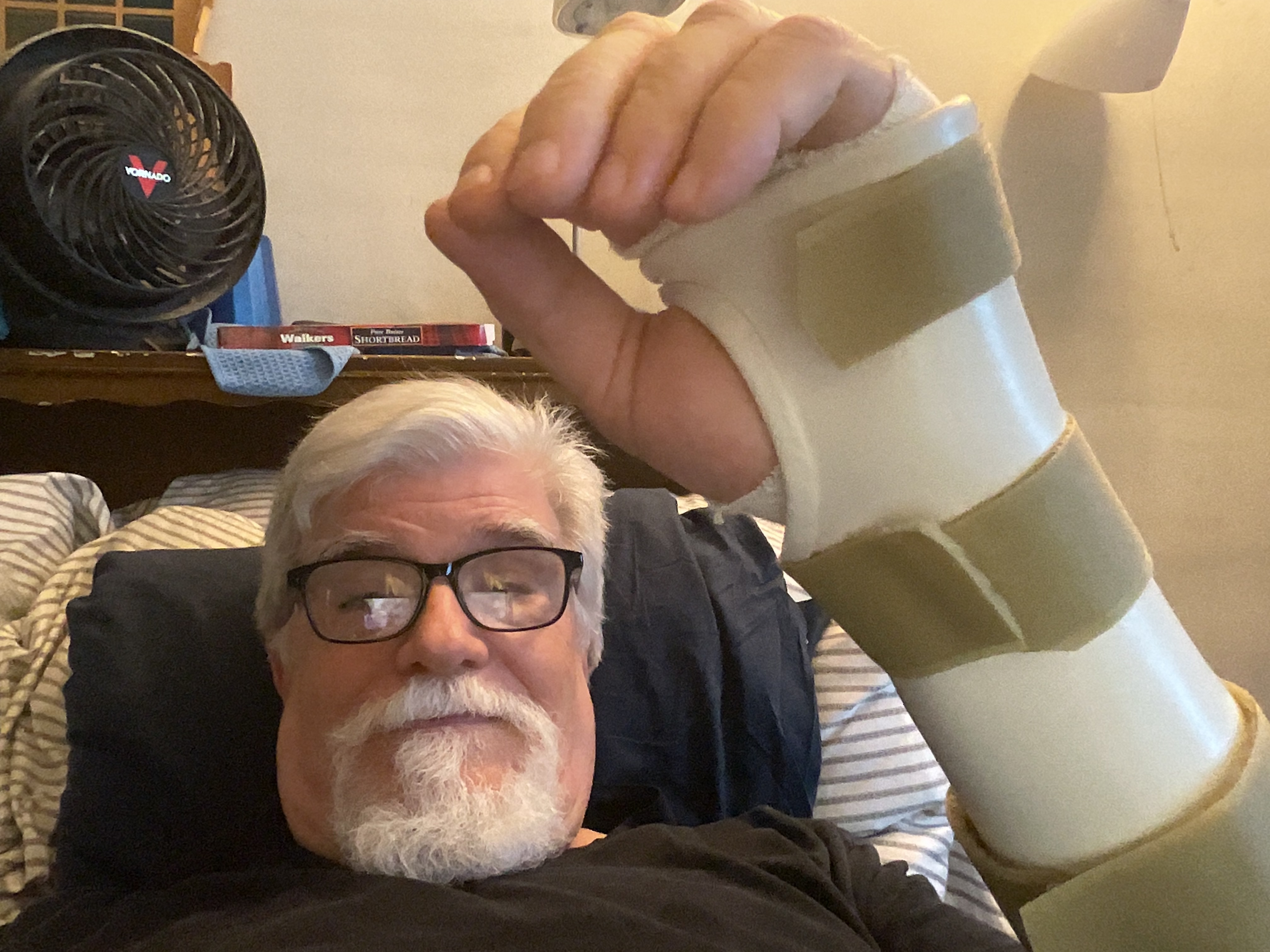 Speaking of impenetrable abbreviations, I recently fell down and hurt my hand trying to catch myself. Saw a hand specialist surgeon who said we could try immobilizing the fractured bits for a couple weeks, and sent me down the corridor to Occupational Therapy where the cheerful folks fabricated the brace you see in the pic.