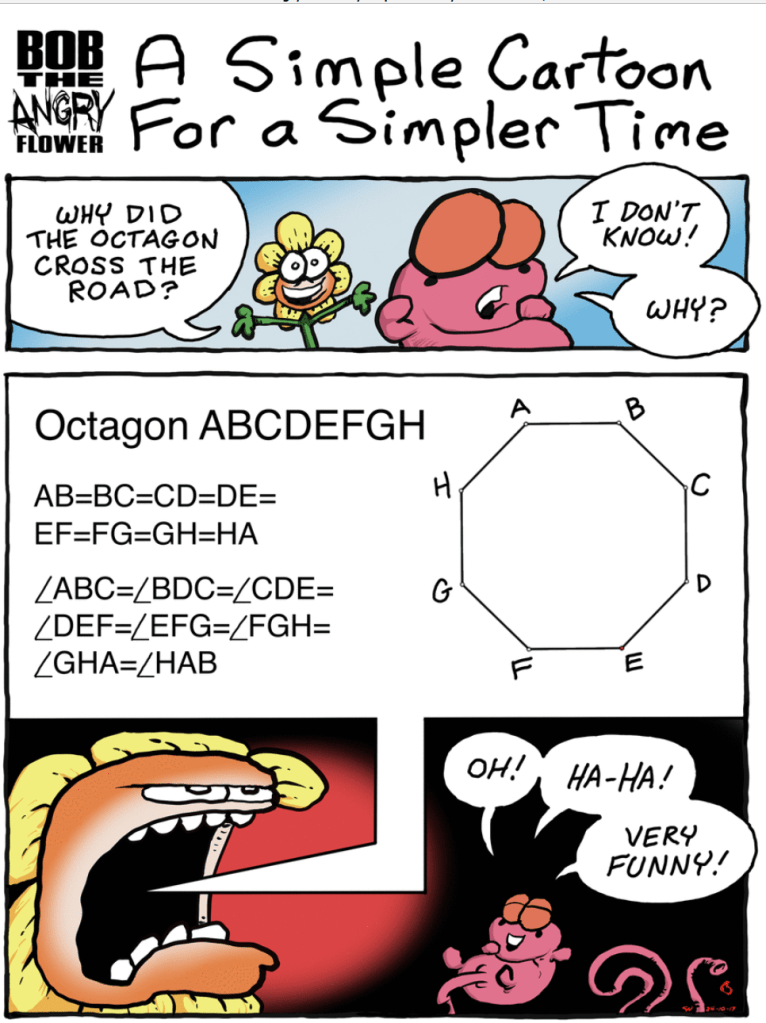 Jack Applin sends this in. “Bob states that all the sides and angles are equal, which is true for a (regular) octagon. Yes, and … ? Is it a gag about the word “side”, that there’s no need to get to the other side, because all sides are equal?“