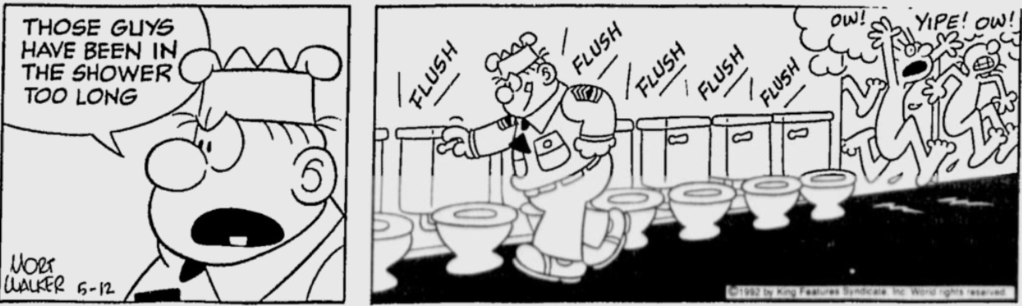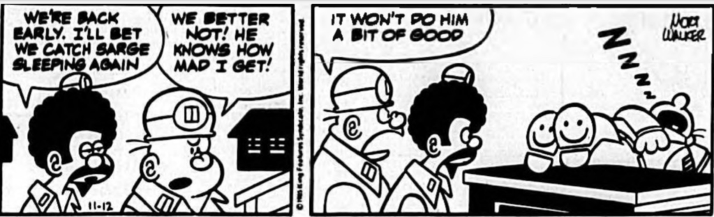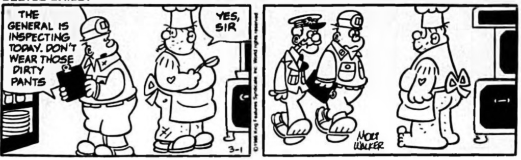 Walker did a number of strips that weren’t for publication that really ramped things up. There was one where the men were going to carry some nurses across a river by having them sit on their shoulders. Sarge yells out to one pair that she’s facing the wrong way. She tells him to shut up. I hope I described that well enough.