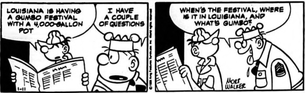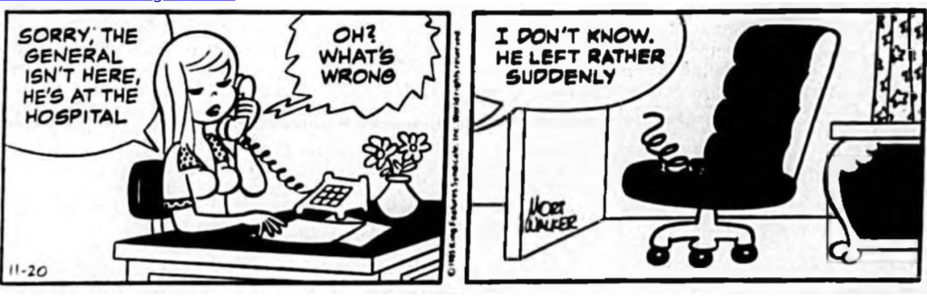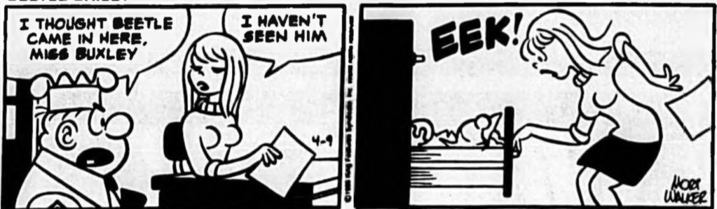 JMcAndrew sends in a few old Beetle Baileys, noting “Mort Walker was a weird guy.”