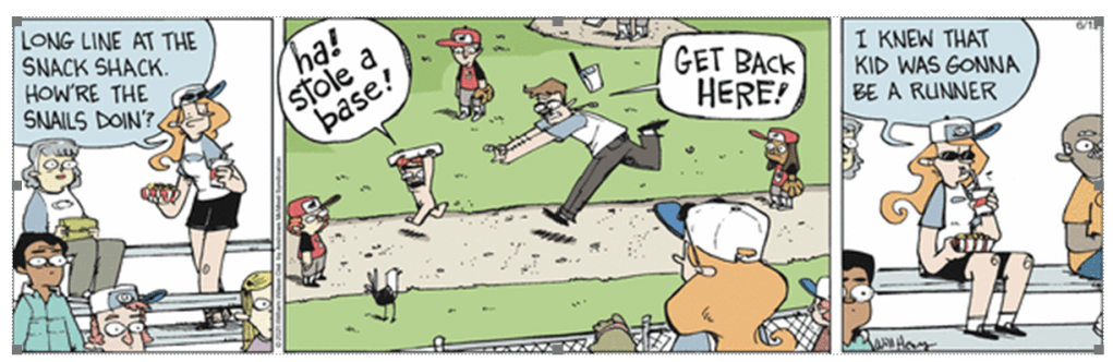 chemgal sends this in: “For those unfamiliar with the strip, it’s worth noting that she is the mother of the young streaker, and the coach chasing him is his dad. Her very chill attitude contrasting the wide-eyed stared of the other spectators is what made me laugh.”
