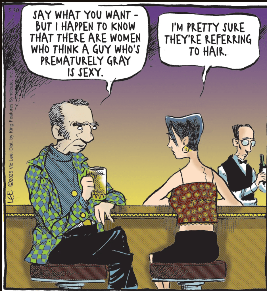 Usual John sends this in: “Is this perhaps a colorist’s error? I don’t see any premature gray other than hair.”