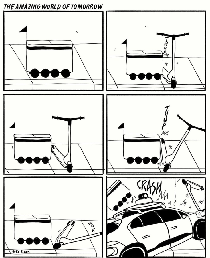 A delivery robot runs into a carelessly-placed rental scooter which falls over, confusing an autonomous car and causing an accident. “The World of Tomorrow,” the title tells us. The author is saying that these technological advances are not improving our lives.