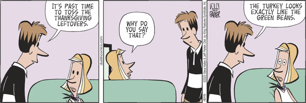 December 21, 2025December 17, 2025 by multipleciduers Sunday Funnies – LOLs – December 21, 2025 (Not a Cidu), LOL Brian Crane, Dustin, Frazz, Greg Cravens, Jef Mallett, Pickles, Steve Kelley and Jeff Parker, The Buckets 1 Comment Meanwhile, there a bit more comedy left over from Thanksgiving. Boise Ed sends this in: “Another good reason to get a smaller turkey next time.” Related
