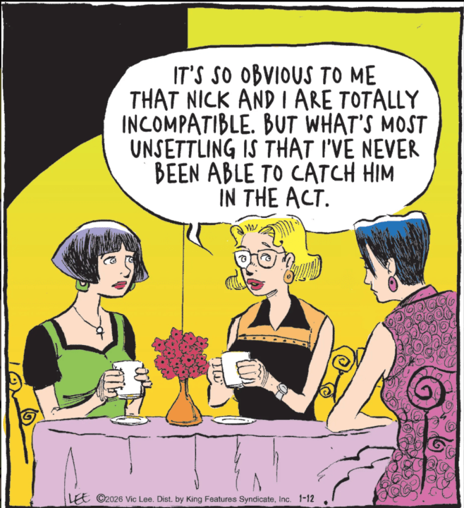 January 14, 2026January 12, 2026 by zbicyclist Incompatible CIDU Pardon My Planet, Vic Lee Leave a comment And what would the act of being incompatible look like? The blonde isn’t a frequent character in this strip. I find myself thinking of that Nat King Cole hit, “Unforgettable”, but with “Incompatible” substituted. Related