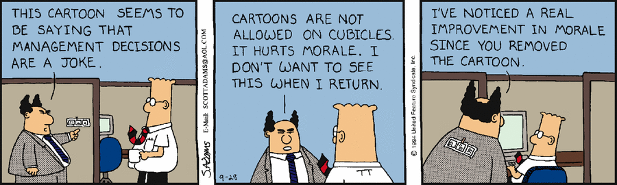 I remember this bit of advice: “Don’t ask your employees why they have Dilbert strips hung up in their cubicles.”
