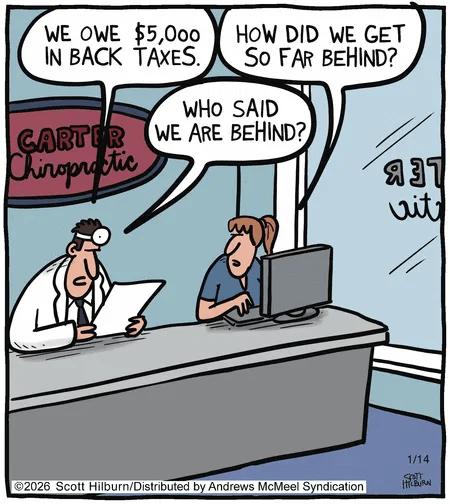 The Hilburn (at the top) is something of a CIDU for me. Is the pun on “back”, because they’re a chiropractic office and backs (of a body) are special for them? Or is it about “behind”? Or even “No, we’re not behind in paying, as we are not paying at all”?