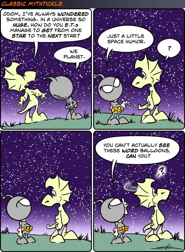 The dragon was confused at the “space humor” line because it heard, “We plan it.” The alien then realizes that the dragon missed the pun because it can’t see the words written out.