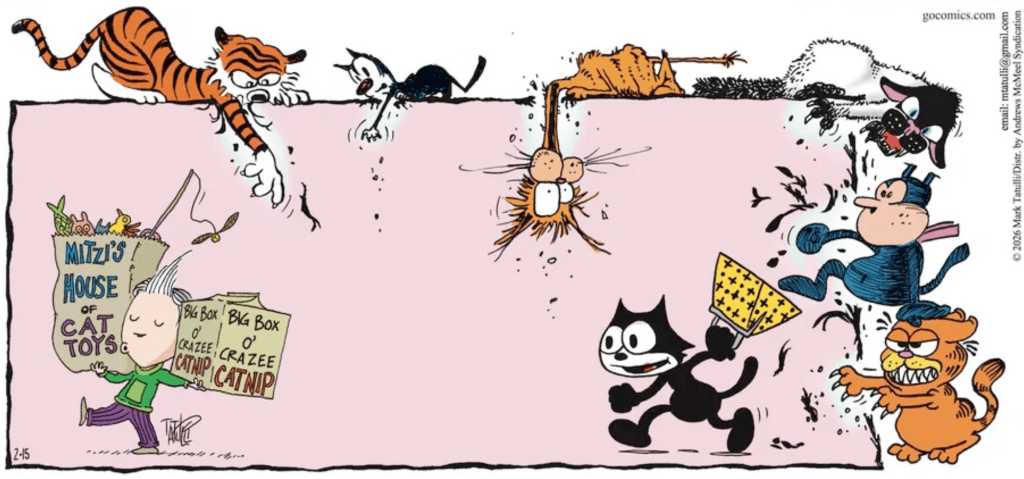 February 22, 2026February 21, 2026 by multipleciduers Sunday Funnies – LOLs – February 22, 2026 (Not a Cidu), LOL Bunny Hoest and John Reiner, Ellis Rosen, Lio, Lockhorns, Mark Tatulli, Ruben Bolling, Super-Fun-Pak Comix Leave a comment Lio works in some of the best known cats in comics. Can you name them all? Dedicated to all the times we read a comic and say “What’s the joke here?” Related