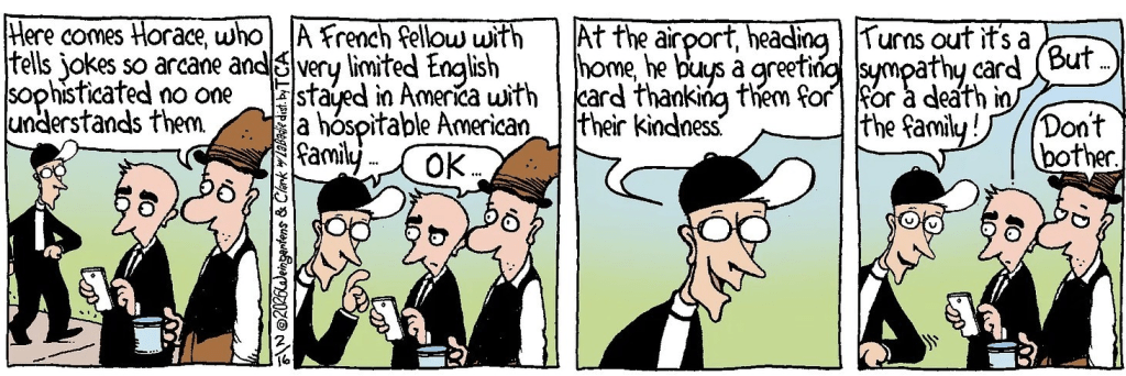 Even the sophisticated mitch4 is confused by this one: “So, what French/English translation oddity, or sound-alike, or pun, would make a plain American sympathy card look to a Frenchman like a thank-you card? I can’t figure it out. Or do I have that set.up wrong? “