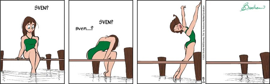 Usually I can understand the 9CL strip. It’s pretty formalistic, with a gag built around a super-hot, oversexed bimbo who is somehow coupled with a worshiping wimp who collapses into a catatonic state whenever in close proximity to said sexy partner. There are a half-dozen of these couples and while Brooke usually focuses on Super-Bimbo (Edda) and her identical daughters (Lolly and Polly), he occasionally switches things up and brings in one of the second banana couples. This week Brooke has turned the strip over to animal doc Fleurrie and her assistant / husband Sven who for the past three days have been rolling around among the cow chips while poor cow patient, Victoria (who can’t seem to swallow her grass), is forced to watch. Today, though, the scene shifts to the local lake where Fleurrie takes a dip into the frigid New England waters. Sure, it is the standard setup to have one of the hot women in a bathing suit but is there a joke here?