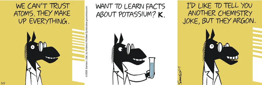March 7, 2026March 3, 2026 by multipleciduers Saturday Morning OYs March 7, 2026 (Not a Cidu), Oy Dark Side of the Horse, Glasbergen cartoons, John Deering, Justin Thompson, MythTickle, Randy Glasbergen, Samson, Strange Brew Leave a comment Kedamono sends this in: “And maybe a wee bit of “Ewwww”.” Where do you find the magazines in a chemistry library? On the periodical table. Related