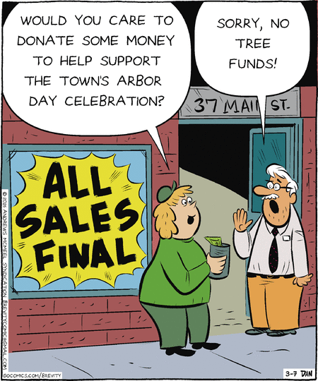 “Tree funds” sounds like “refunds,” and all sales are final at this store, as the sign indicates.
