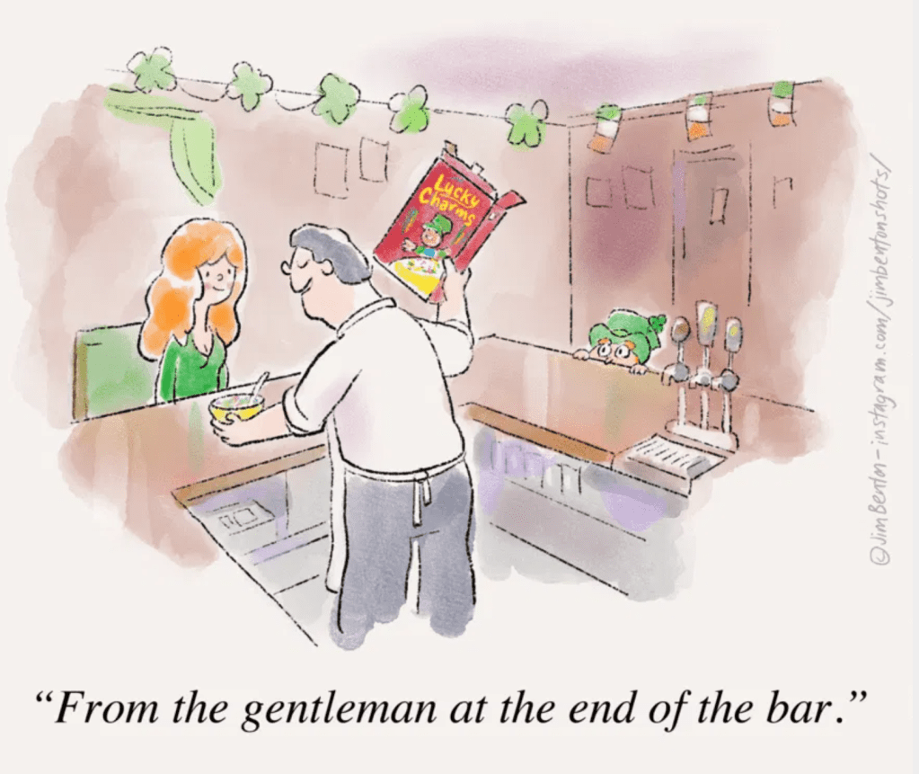March 17, 2026March 11, 2026 by zbicyclist Happy St. Patrick’s Day Image (Not a Cidu), Holiday-Thematic, Saint Patrick's Day Jim Benton, Jim Benton Cartoons Leave a comment Related