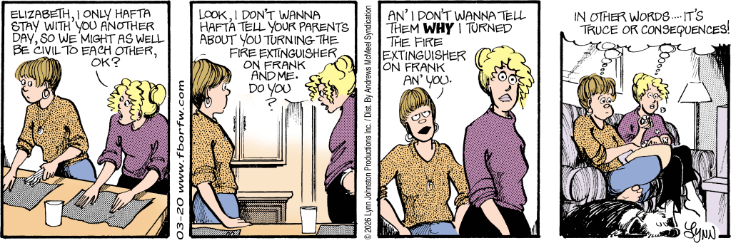 Boise Ed sends this in: “Background: Parents are off on a vacation, Dad’s young assistant is staying with the kid while her home is fumigated or something. Kid catches assistant canoodling with boyfriend and uses a fire extinguisher on them. (That part ran March 9-13.)”