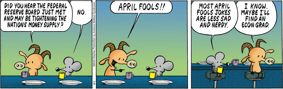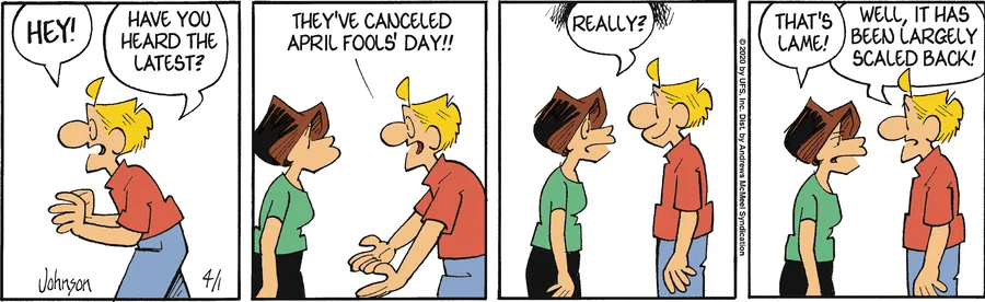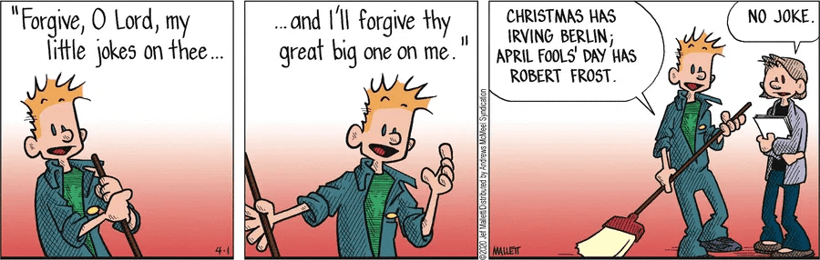 April 1, 2026March 29, 2026 by zbicyclist Pity the Fool April Fool's Day, Holiday-Thematic Arlo and Janis, Doug Savage, Frazz, Jef Mallett, Jimmy Johnson, Pearls Before Swine, Savage Chickens, Stephan Pastis Leave a comment A few very nerdy April Fools’ Day comics.
