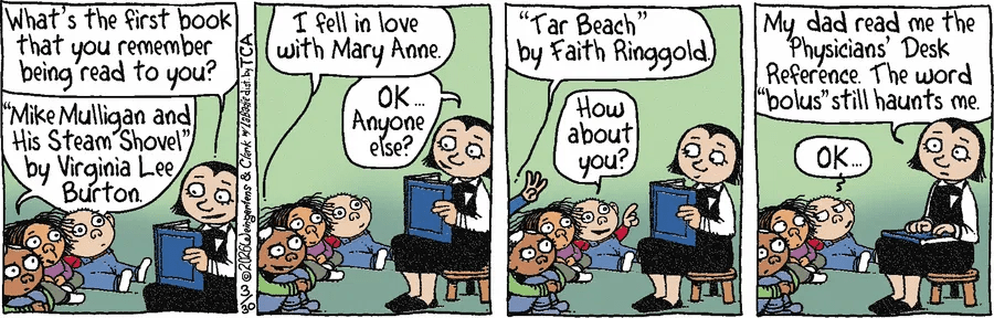 April 3, 2026March 30, 2026 by zbicyclist First Book You Remember (Not a Cidu) Barney & Clyde, Weingartens & Clark Leave a comment I don’t remember any books being read to me. I read to my daughters, beginning with Pat the Bunny, Goodnight Moon, Peter Rabbit, Where the Wild Things Are, and other classics. How about you? What books do you remember being read to you? Related