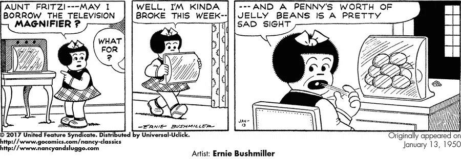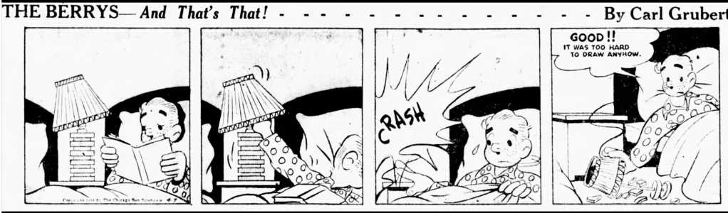 The Berrys, by Walt Ditzen: April 7, 1944. While filling in for Carl Grubert during World War Two, Walt Ditzen grew increasingly tired of drawing the elaborate lamp in the Berry bedroom. This strip was his solution. (Source: Mort Walker’s Backstage at the Strips: 1975).