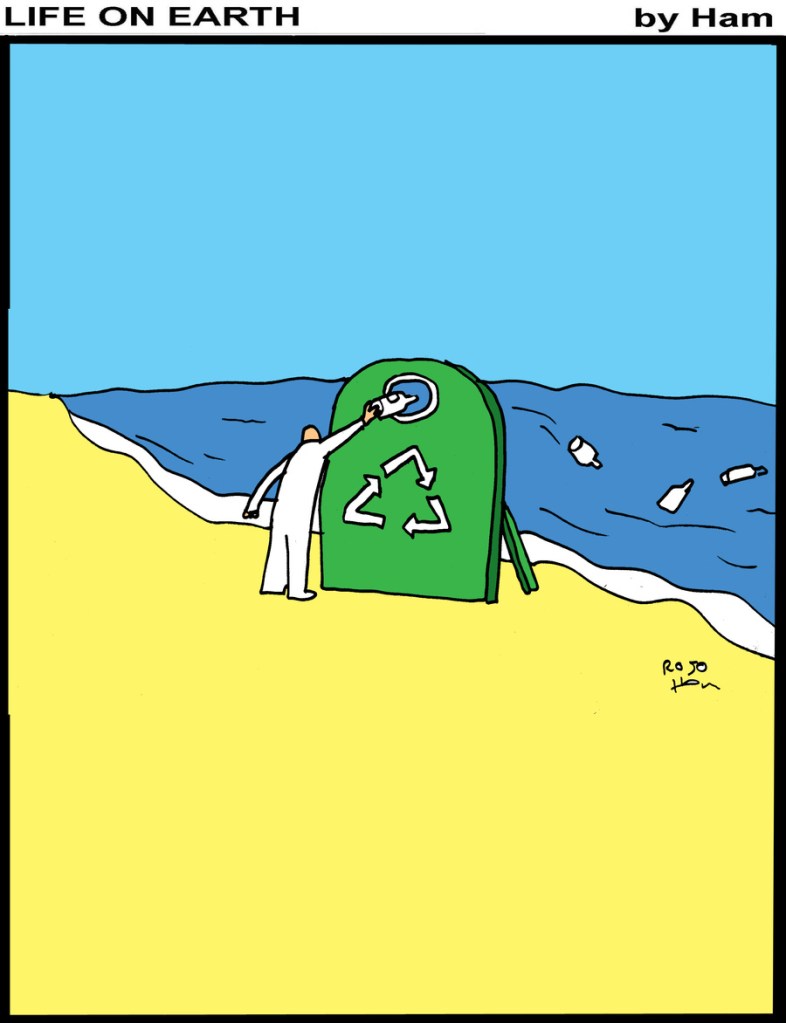 There seems to be a point, something cynical or at least skeptical, but hard to pin down. “Recycling is just a fake anyway”?