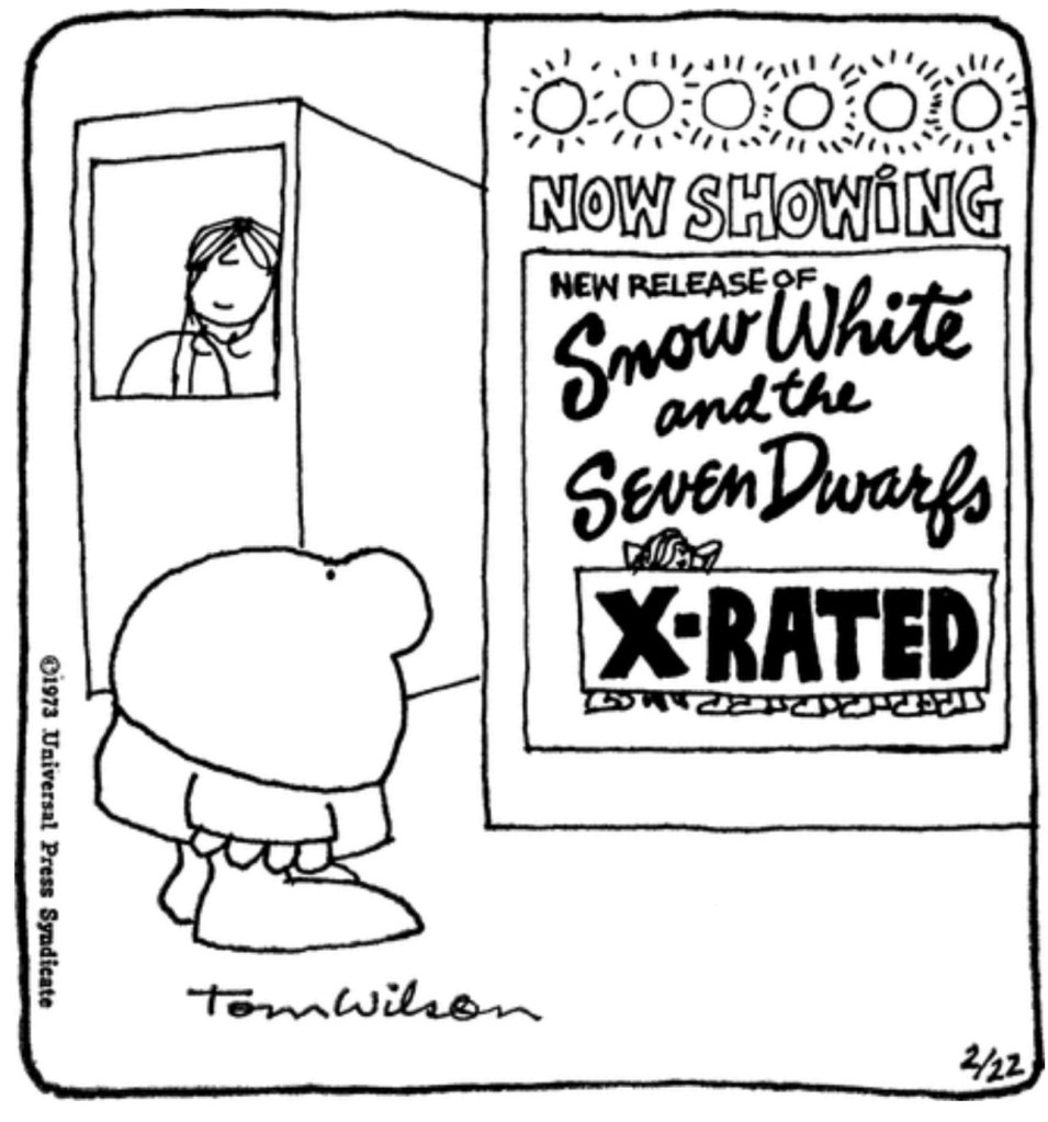 JMcAndrew sends this one in: “There’s a new Disney Snow White movie in the theater today and although I haven’t seen it yet I don’t think it’s going to be X-Rated. Also I want to point out that if you look really closely under the banner that says “X-rated” you can see the feet of the dwarves who are apparently participating in an orgy. … I think Ziggy himself is a “little person” so maybe he is just going to see it out of a sense of solidarity.”