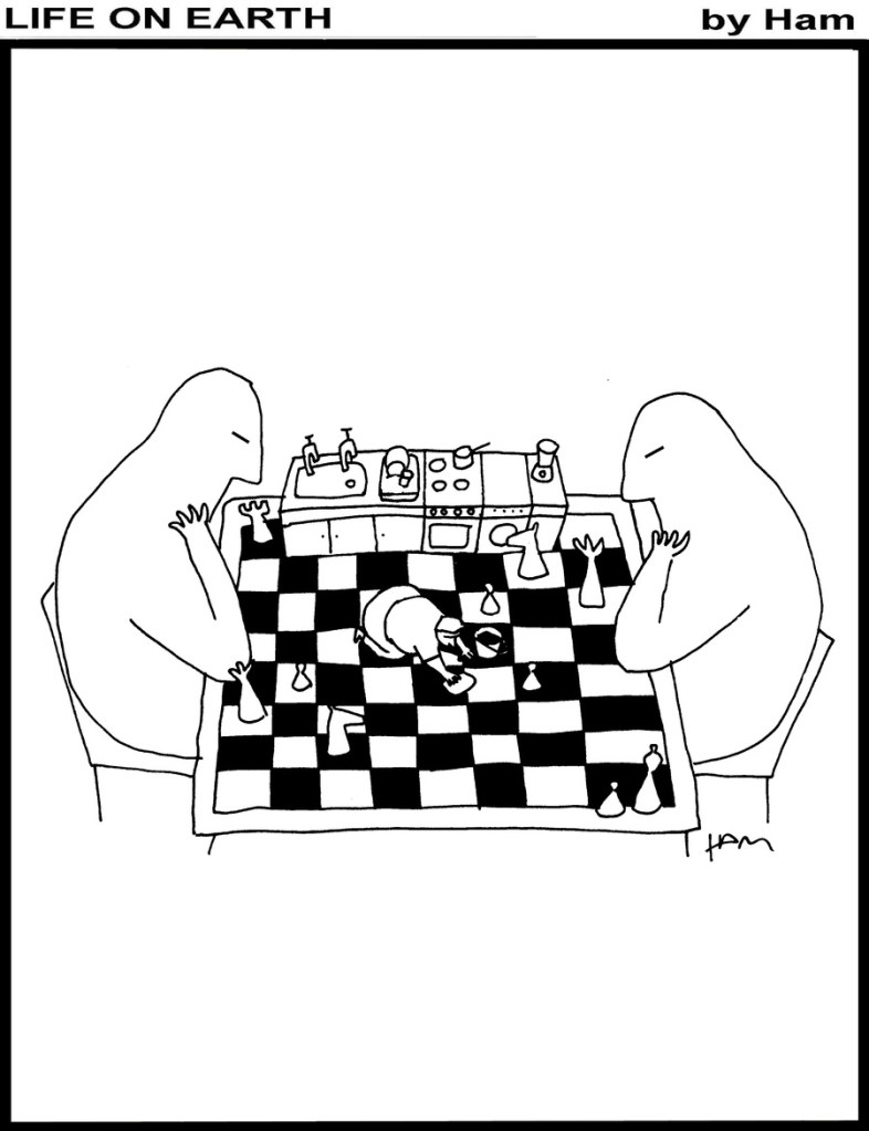Sometimes Life on Earth will seize on some setting or prop or situation to use in several daily panels, without any clear intent to take them together as anything like a narrative sequence or theme-and-variations. All I can come up with about the examples below is that they all involve the game of chess, in one way or another.