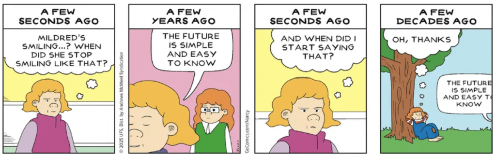 This one also may not perfectly fit the premise: I sort of see a joke, and it’s sort of funny. But mostly the point seems to be just contemplating the sad aspects of the absurdist situation.