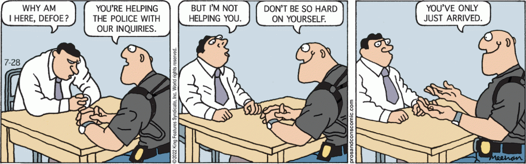 Thanks to CloonBounty for sending this in and engaging the co-editors in discussion, starting by remarking “Can you help me out with this? I get the punny gag. But why did the one who merely listened to the ‘bad pun’ get the punishment?”