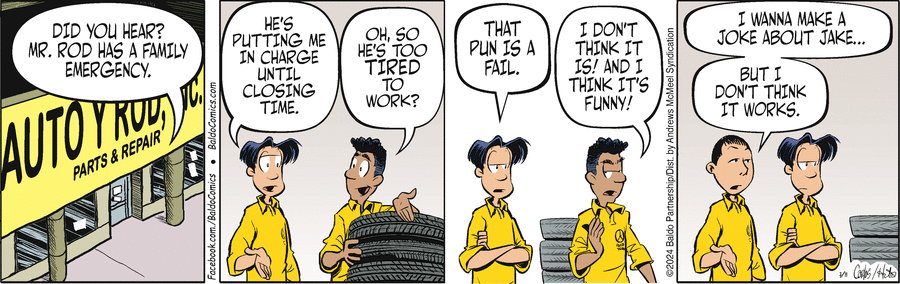 Here there are two loci for our standard questions: In panel 2, the dialog from the second character (who I think must be Jake); and in panel 4, the second part of the dialog from the speaking character.