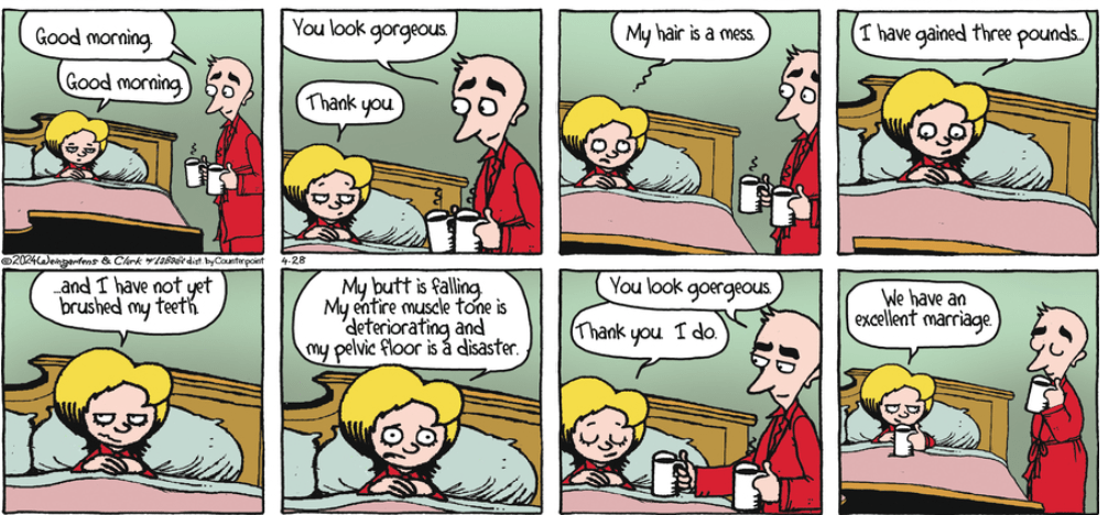 In panel 7, the repeated compliments, and perhaps the coffee, have mollified her, but I don’t get the expression in her eyes in panel 8.