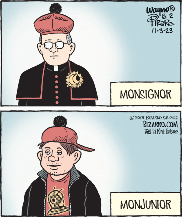 This was a momentary CIDU, for want of a comma. Sent by Boise Ed. Ed did some research on our behalf and reports “If you look in the [GoComics] comments, you’ll see that it caught Mark Parisi by surprise.”
