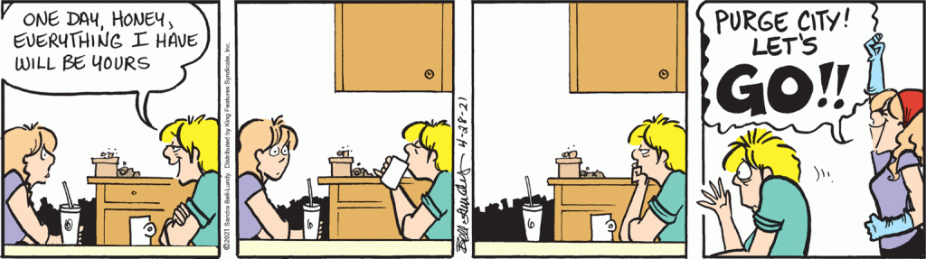 The startled reaction of Emma (the daughter) in panel 2 must be preparing us for the weird drama of panel 4; but why? And why is she wearing gloves — dishwashing gloves? — for her big announcement? And especially, what does she mean by “purge”? A reference to the movie series? A different way of talking about simplifying and tossing out whatever does not give joy (and is not worth inheriting)? We hope it’s not another name for “juice cleanse”!