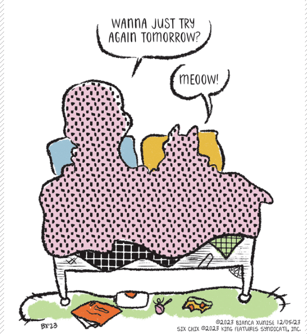 But then now Mark M sends it in and notes some complicating factors: I’m thinking if you’re not a MLB fan AND a geezer, this comic will be confusing. I’m both and it’s still confusing. Pudge was a nickname for Carlton Fisk, who played as a catcher some 50 years ago. A very good player, so “dream catcher” is a great pun. Maybe this belongs as an Oy or LOL. But the CIDU part is the response in Spanish. Fisk was born in the U.S. and had no Latino connections that I’m aware of. And then there’s maybe even more to this if we start to worry about him saying “This is how it works” which may go on only some readings.