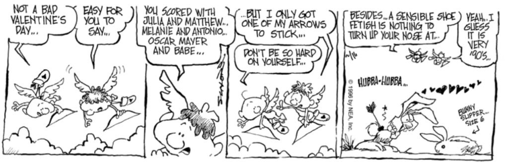 JMcAndrew sends these two in. “Not only does this comic end with a rabbit about to hook up with a shoe but it also manages to slip in a joke about the title character from the movie “Babe”in a relationship with “Oscar Mayer””