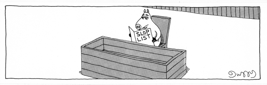 The joke is somewhat spoiled (or at least delayed) by the way the sightlines are drawn. But it emerges that what sound like rules for a tweenage girl being left home alone are being directed to Baby Bear (the dog); who isn’t agreeing to them.