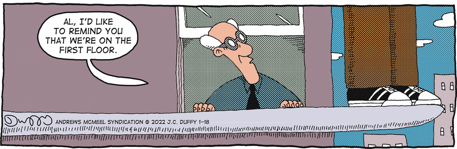 Here are two from dollarbill (and a third one we happened upon) with the 4th-wall or meta- theme of characters knowing they’re living in a cartoon. He mentions he has been “wading through J. C Duffy‘s humongous almost daily blog posting of comic/photos/short musings beside them sometimes,” which go back years. “Fusco Brothers is just one of his outputs. The number of fly-in-the-soup variations is staggering.” CIDU has sometimes featured Duffy’s Lug Nuts, somehow strikingly different in graphics appearance yet very recognizably his work.