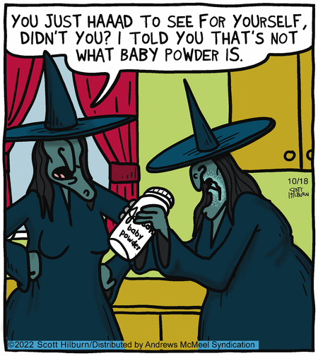 The “featured comment” at GoComics gives an explanation for the first one: “Well, if you make corn oil out of corn, and olive oil out of olives, guess what you make baby powder out of” (she tried tasting it).