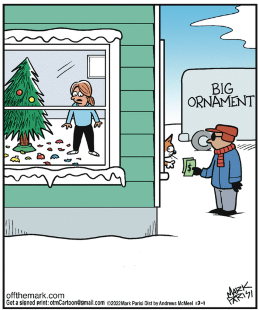 You get to vote here: is the cat giving money to Big Ornament to pay for replacements, or is Big Ornament paying the cat for breaking ornaments, so they need replacement?