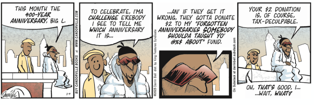Is Darrin Bell just trolling us? 400 years would be January 1625. I got nothin’.