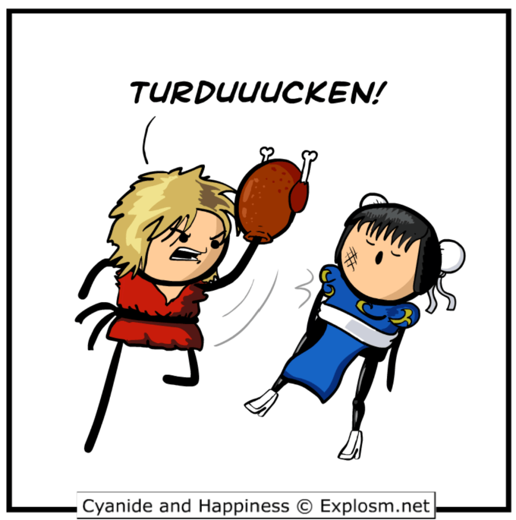 Jack Applin sends this in: “Ken Masters (https://wikipedia.org/wiki/Ken_Masters) from the Street Fighter (https://wikipedia.org/wiki/Street_Fighter) video game is hitting Chun-Li (https://wikipedia.org/wiki/Chun-Li) with a … turducken? Is this a power move, equivalent to hitting her with a turkey, duck, and chicken, all at once? Does Ken often use poultry in battle?”