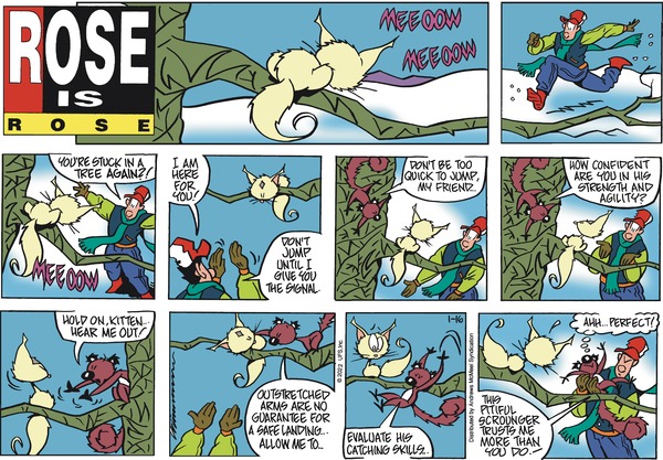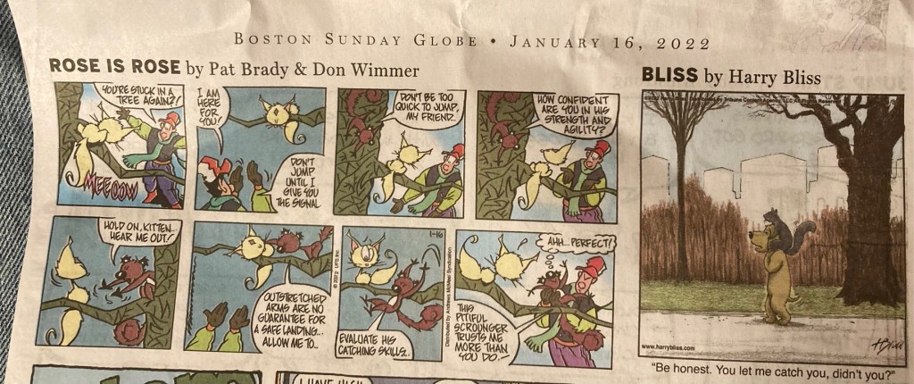 Mark also sent a scan or picture of his physical paper, showing these actually adjacent. The Rose is Rose is good material for the discussion earlier this week about differences in layout and “extra” panels. And the Bliss is also an interesting case of oddities of publication schedule: this one was on GoComics and Bliss’s own site as 1/8, a date which can also be (more or less) made out in the drawing itself. But the newspaper for some reason printed it on 1/16 — and we have confirming evidence of that! —
