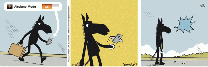Dark side of The Horse so often breaks new frontiers in cartoon-physics! And we usually call that LOL, but here there is wordplay on “airplane mode” that should qualify for an OY.