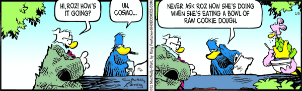 From alGeo who, aside from submitting this as a CIDU, also claims “‘How’s she doing‘ is not the same as ‘How’s it going.'” Are they right? Obviously, the words are literally different, but for me (Winter Wallaby), those phrases have the same meaning.