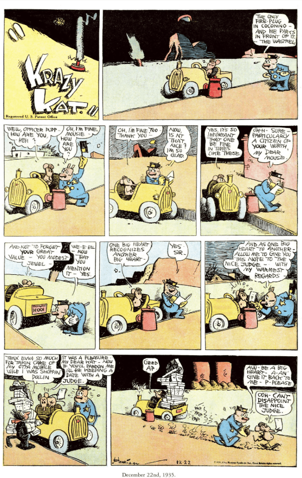 Ignatz was first disdaining the advertised job of “brick hand”, but according to the printed subhead “Ignatz Will Love His Work” he does get employment at the Kelly brick yard. What accomplished this turnaround? Was it seeing Krazy Kat working there in panel 3? Will he be a “brick hand” or something else?