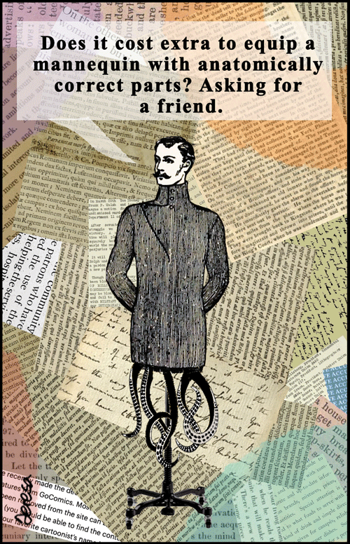 Thanks to Dana K for this Today’s Szep. The main joke is easy enough: the mere unlikely existence of this rack and these categories of card message. But what is all that ancillary action supposed to be about? Do these two know each other? Or is the woman just a judgemental bystander? Is she saying something, or just standing there with her jaw dropping?