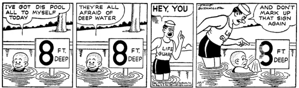 The first Peanuts strip in this collection doesn’t fit into any category, because it has a singular “birthday” significance; it was originally published on Friday, July 8th, 1955 (the day that Bill Bickel was born):