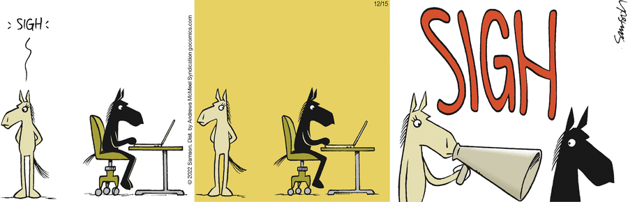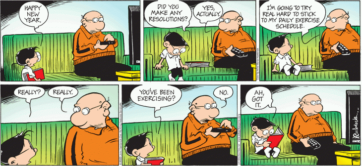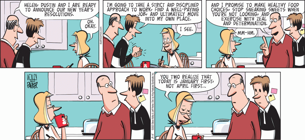 Speechless Santa. Fill in your own dialogue. (GoComics posting error on 12/15. It’s clearly a GoComics error, becauseArcamax shows the dialogue. GoComics corrected the error a day later.) It’s oddly meta, because panel 3 in the actual dialogue accuses Santa of not keeping up with the latest technology.