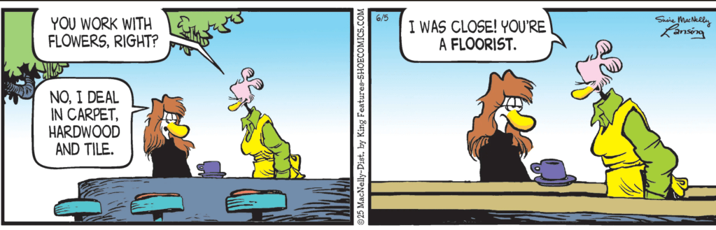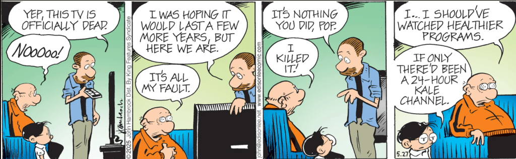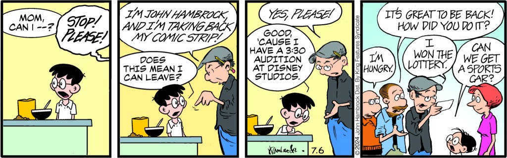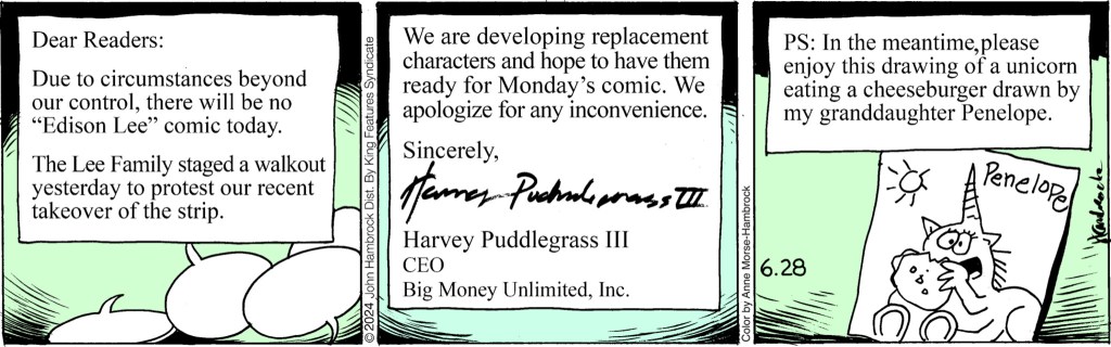 Boise Ed called our attention to an entire story arc from “The Brilliant Mind of Edison Lee“, commenting: “This takes the Fourth Wall idea to a new level. Starting with Monday, June 24, John Hambrock had a private equity firm take over the strip, first replacing the furniture and then the characters themselves, to scrape expenses. The daily jokes were (intentionally) pathetic…. Basically, it was a two-week screed against the evils of soulless private equity firms….”