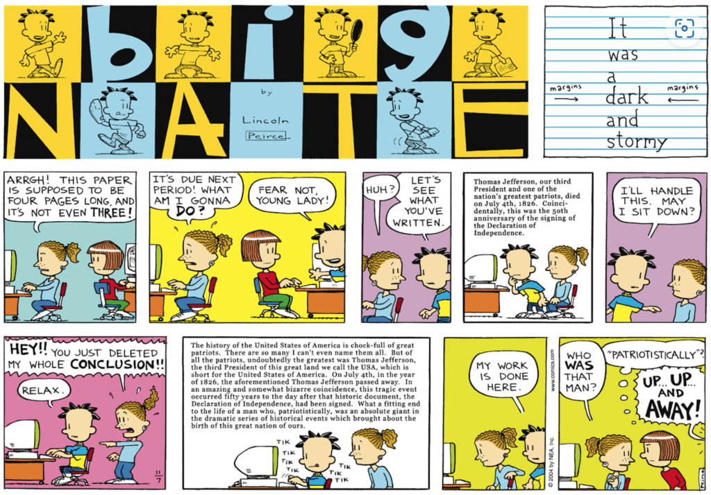 Backstory: Nate has decided that since he has a math test coming up and a book report due, he’ll take a shortcut and combine math study with the book report.