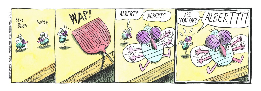 … The slapstick “flattening” might have worked if the strip had ended at the third panel (shifting “Are you OK?” into the second dialog balloon), but including the partner’s desperation and anguish in the fourth panel transforms the remnant of humor into a simple tragedy, leaving nothing to laugh at or feel good about. Thankfully, the hiatus was just for one day.